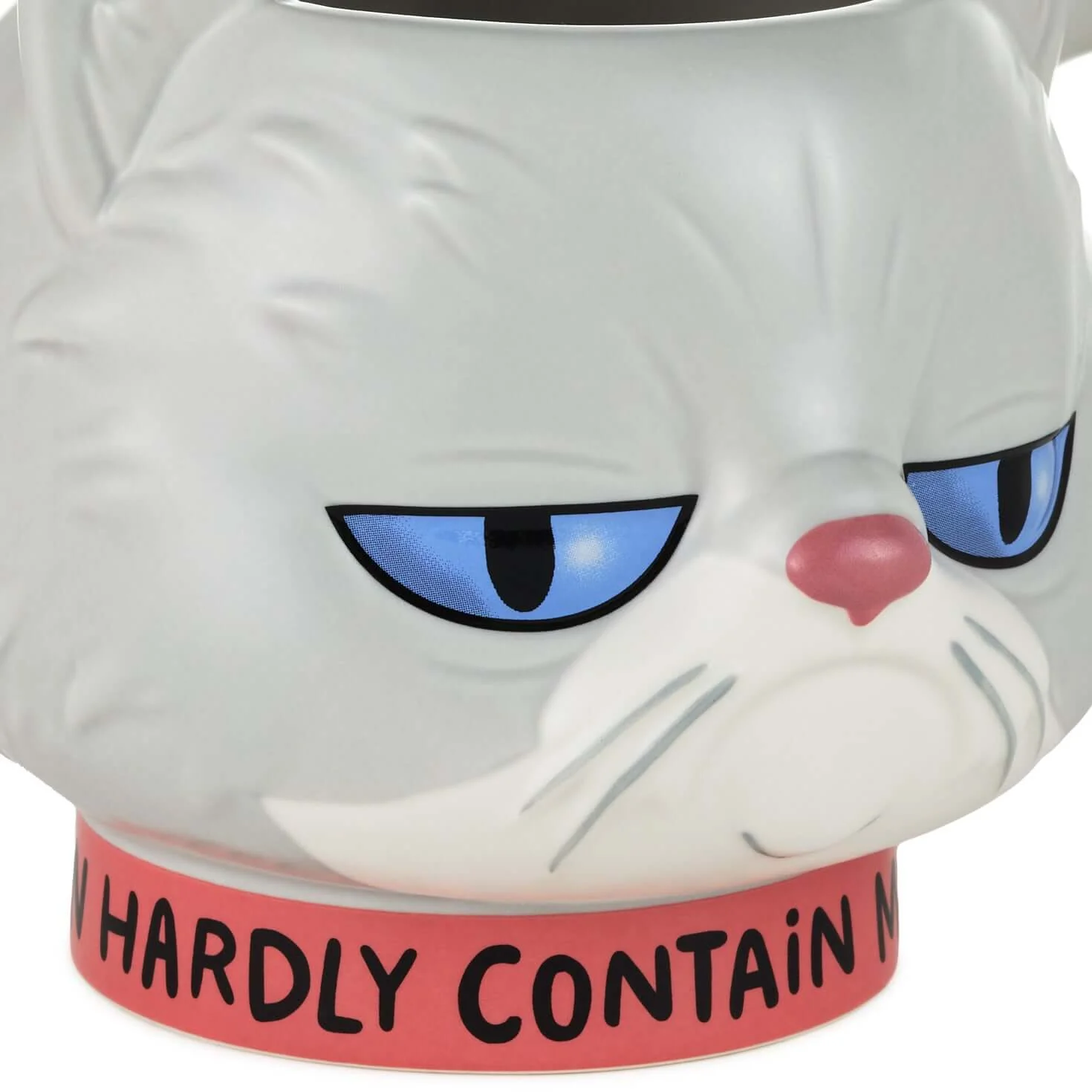 Who needs their caffeine in this funny cup to beat the Monday blahs? Scratch that. You do! Dress up your morning routine any day of the week with this cute sculpted mug that brings nine lives' worth of catitude. The shaped ceramic cup displays a furry gray feline face with a frowning expression that's sure to brighten your own mood with its absurdity. Wearing a snarky message around its pink collar, this grumpy puss features embossed and debossed fur and whisker accents, pointy ears along the top edge and a rounded handle. Shaped cat cup makes a great gift for coffee lovers and finicky feline fans.